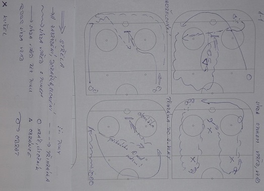 rozjetí hráče z prostřed - přihrávka na modrou čáru NA HOKEJKU!!! a zakončení na branku - důraz před golmanem, neodjíždím do rohu po jedné noze, ale DORÁŽET!!!